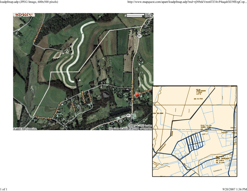Next, I located Daniel Koch’s tract on MapQuest using the roads listed on the Detailed Tract Maps. Then I clicked on “Aerial Image” which gave me the image below.